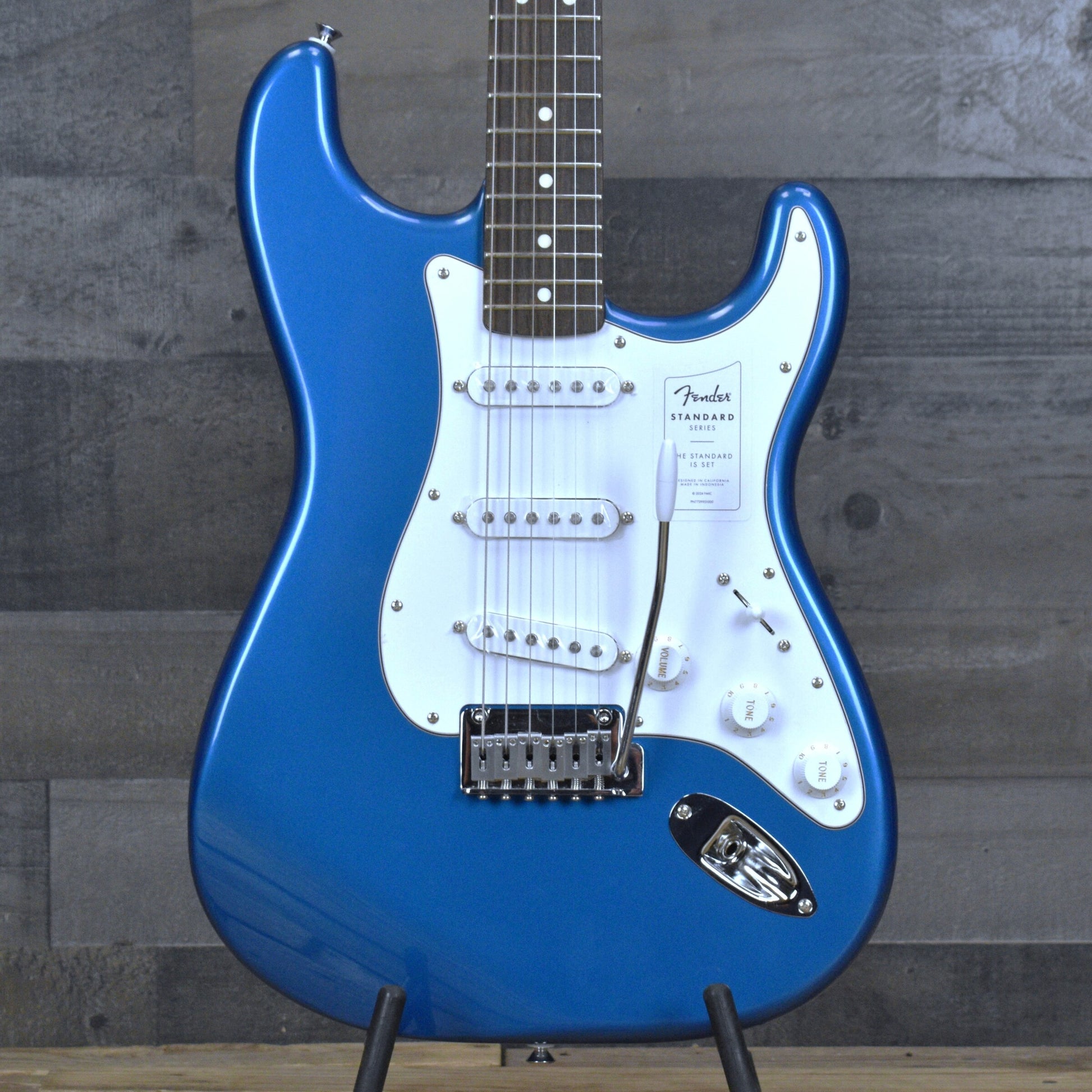 The Fender Standard Stratocaster is built to perform with a 2-point synchronized tremolo bridge with satin chrome saddles, offering stable tuning and expressive vibrato capabilities. A 4-bolt neck plate, dual-wing string trees, and Fender Standard cast/sealed tuning machines ensure reliability, whether in a studio or on stage. The white control knobs, 3-ply white pickguard, and chrome hardware complete the guitar's classic look.