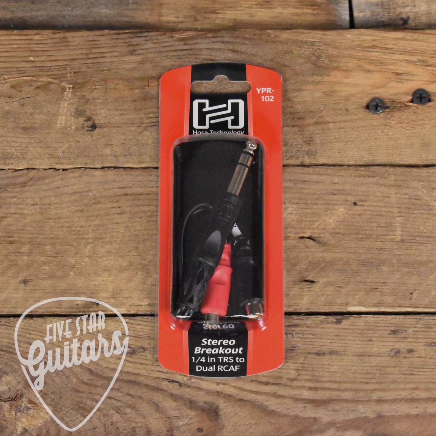 The Hosa Stereo Breakout Cable 1/4in TRS to Dual RCAF - YPR-102 is designed to split a stereo signal. Black- and red-coded phono jacks indicate left and right respectively, ensuring clear and accurate audio connections.
