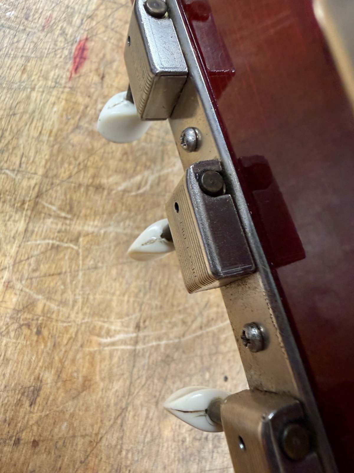 The guitar shows the honest wear of a well-loved instrument. Finish checking is visible across the body with dings on the top and moderate finish wear around the sides. There’s buckle rash on the back, surface wear along the neck, and moderate wear on the headstock. The pickguard has begun to buckle, a common sign of aging materials. The third tuner is slightly bent but turns smoothly and feels solid, and the E-string buttons show minor seam separation typical of vintage plastics while remaining secure and fully functional. Despite these cosmetic signs of age, the guitar remains structurally solid and full of life, with a neck that feels worn-in and super easy to play.