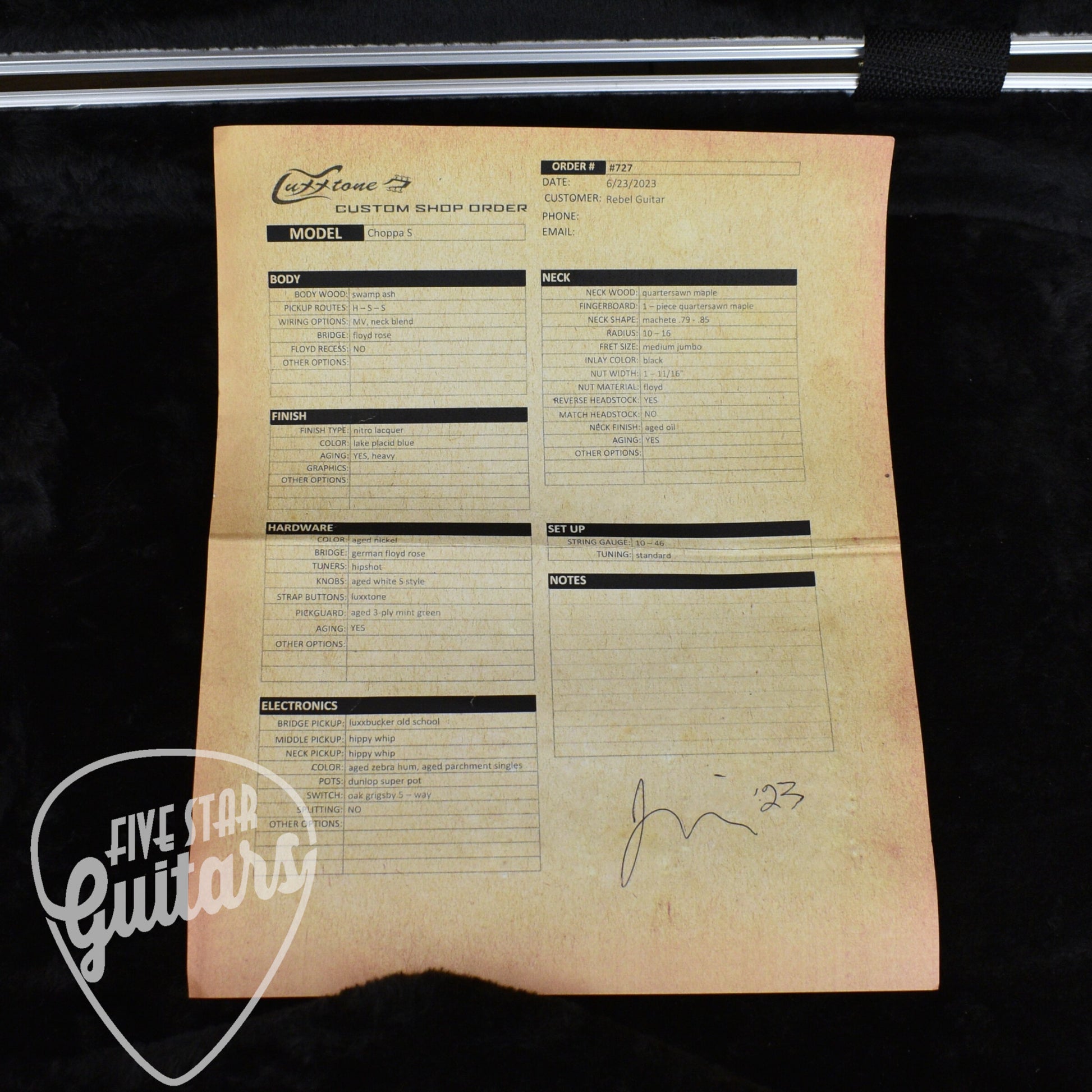 Originally an HSS configuration, this Choppa S has been professionally modified at Five Star Guitars to an HS setup with the original Luxxtone Luxxbucker Old School in the bridge and a Hippy Whip in the neck. The original middle pickup and HSS pickguard are included, giving you flexible options for reconfiguring the guitar down the line.