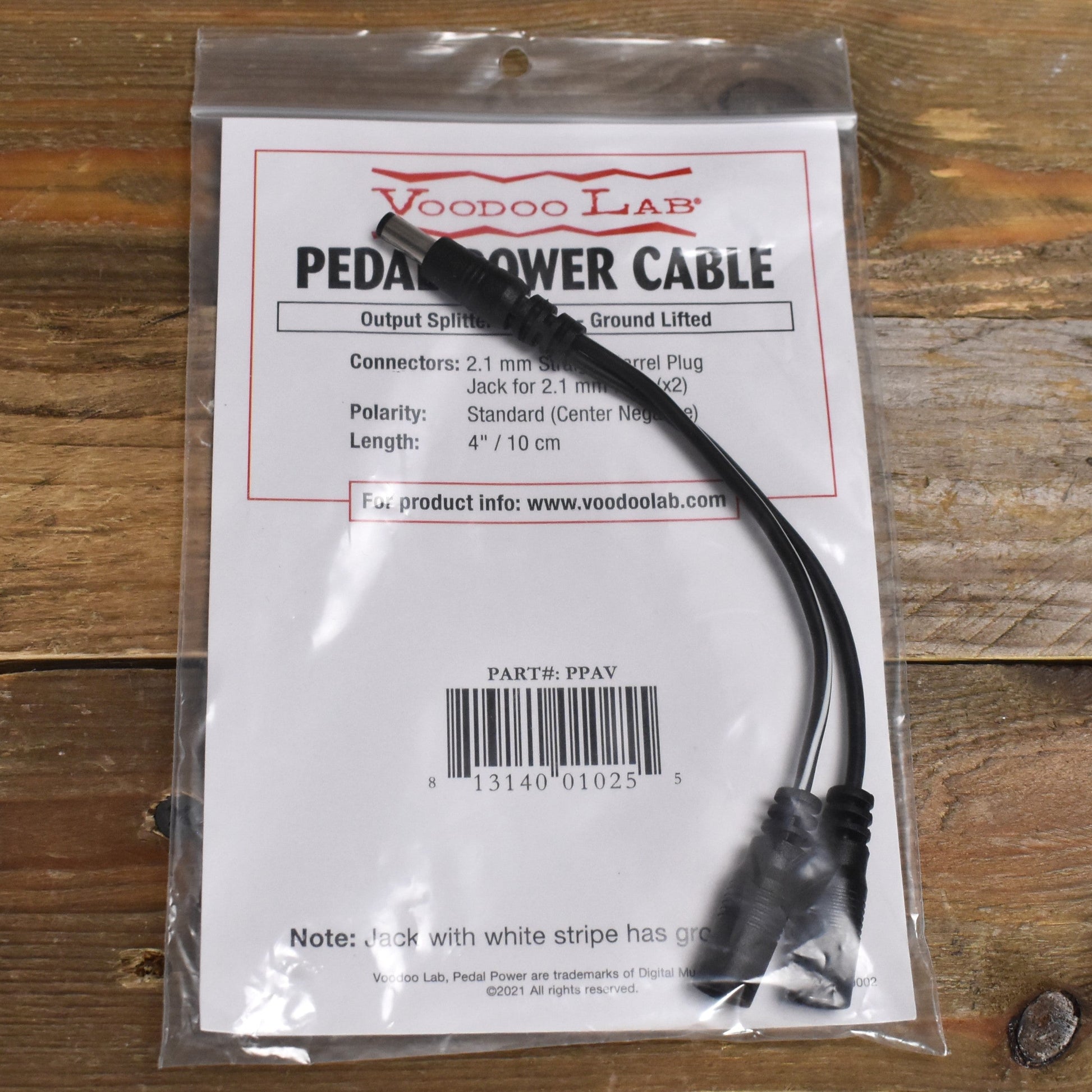 The Voodoo Lab Ground Lifted Output Splitter Adapter - PPAV allows two pedals to share a single Pedal Power output. This splitter features a single BLACK 2.1mm barrel plug to two BLACK 2.1mm jacks which connect to any standard power cable with a 2.1mm plug.